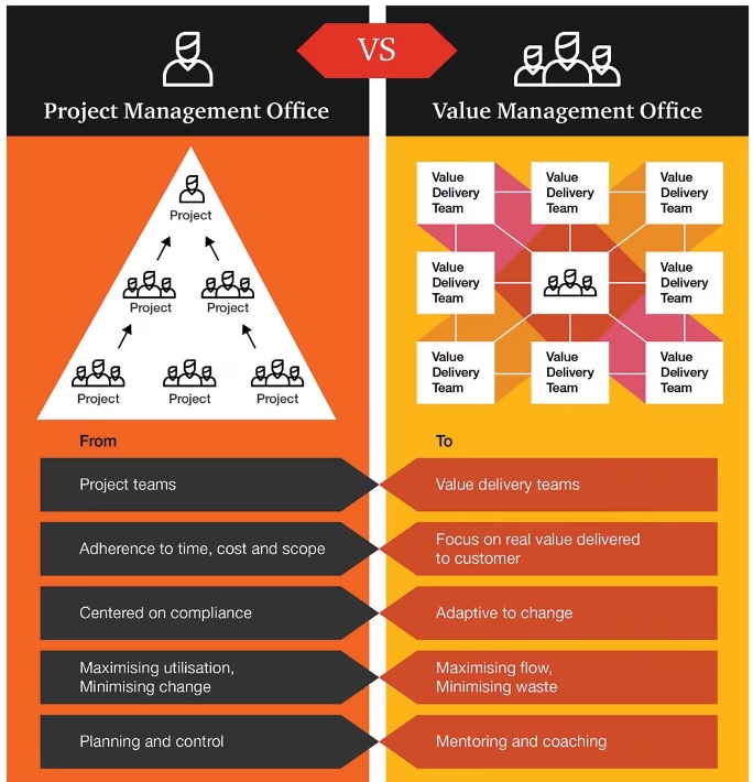 The traditional methods for managing IT programs and teams through PMO are no longer adequate because it is process and compliance driven not value driven.