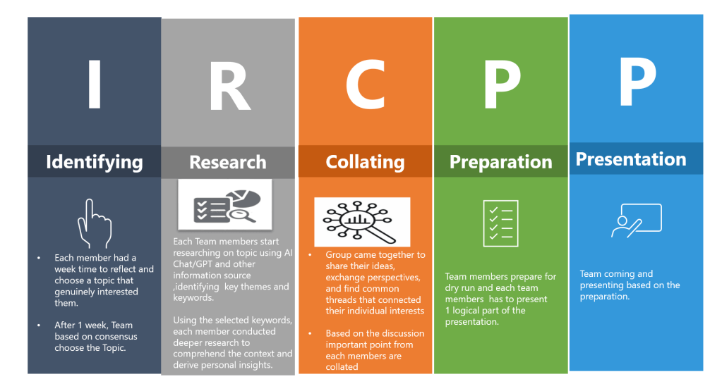 Scenario : The teacher asked the students to work in groups, pick a topic they liked, and make a presentation showing what they learned.
